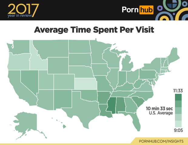 In the USA the average time spent per visit is 10 minutes and 33 seconds, Mississippi, however, took their time in 2017 and spent 11 minutes and 33 seconds each time they visited the site. This must have rubbed off on their neighbors because Alabama was right behind them with no sense of urgency in 2017, being the second state to take their time during their visit to the site. Other states had places to be such as Oregon, Idaho, and Kansas, who spent the least amount of time on the site compared to the other states, spending 9 minutes and 5 seconds.