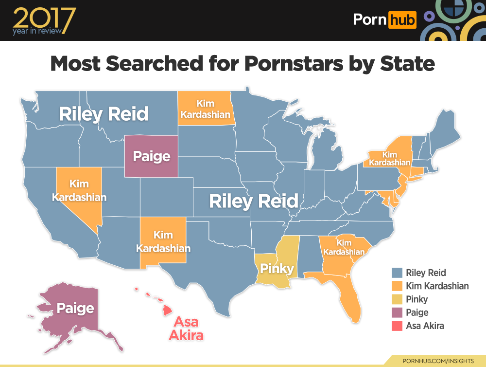 When it comes to pornstars, Riley Reid (nsfw) was 2017’s top search across most of the U.S., with Kim Kardashian (nsfw) being the favorite for Nevada, New Mexico, North Dakota AND of course the hotter, hot spots like Florida, Georgia and South Carolina. The other most searched for pornstars include Pinky (nsfw) in Mississippi and Louisiana, and Paige in Wyoming and Alaska. Paige is actually a WWE wrestler (competing in the first-ever women’s Royal Rumble match later on this month… TBC) who had a sex tape released in 2017, which accounts for the high increase in curiosity and searches!