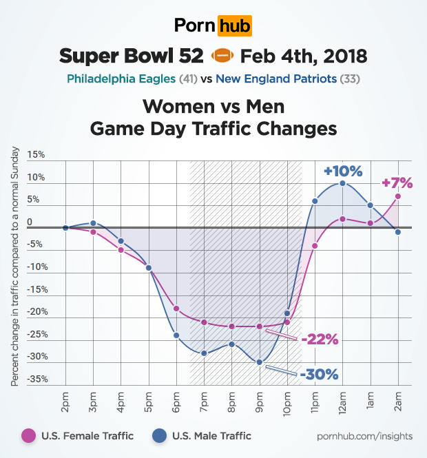 While traffic drops were similar in both Philadelphia and Boston during most of the game, Eagles fans held out a bit longer, with their biggest traffic drop of -58% happening at 10pm. Even Philadelphia’s most dutiful fappers stopped greasing their poles and tuned in to see their team take the championship. By that time however, fans from Boston were already rushing back to Pornhub, where traffic surged +28% above normal in the hours following their defeat.