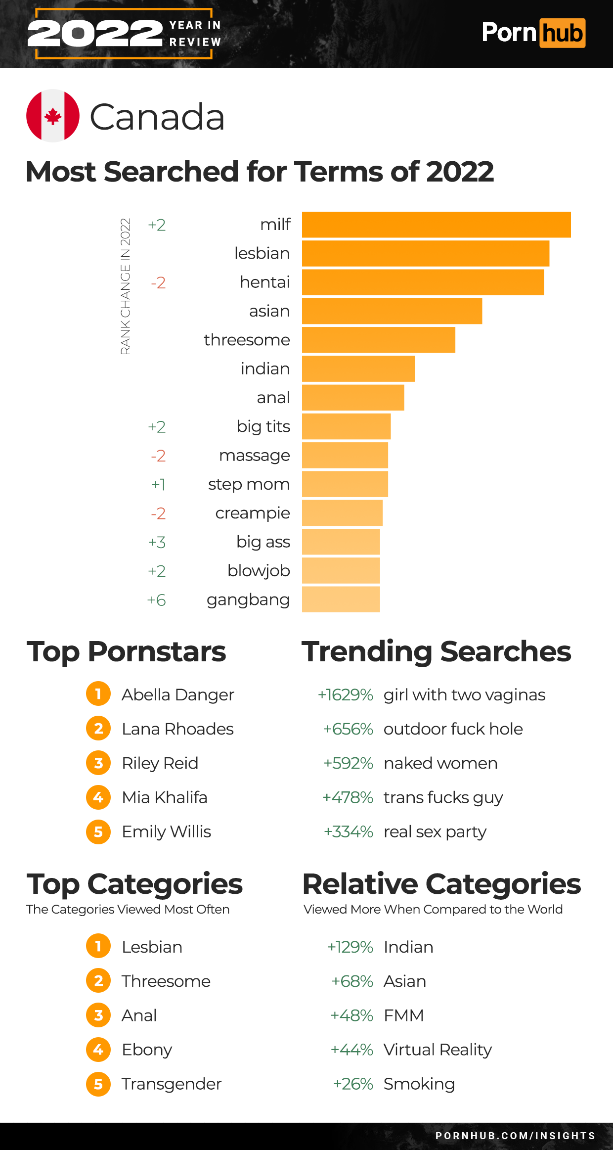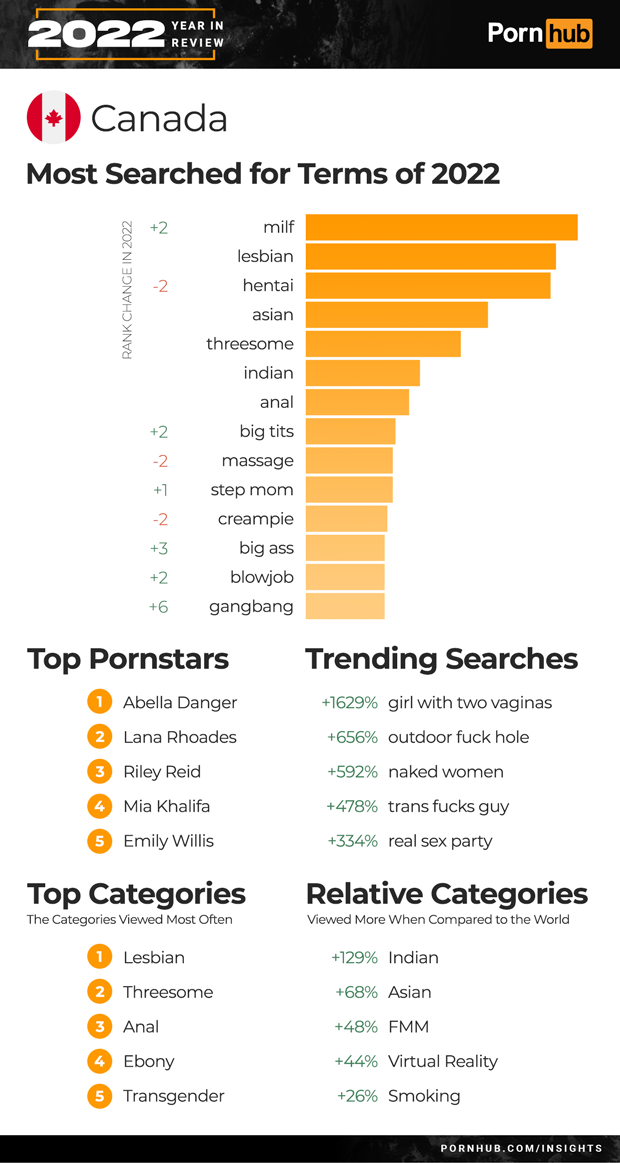 For 2022, “milf” took over the #1 search spot for Canada ahead of “lesbian”, pushing “hentai” down –2 into 3rd. Searches for “big tits” gained +2 in rank, “big ass” +3 and “gangbang” +6 to join the Top 15. Trending searches for the year included a +592% for “naked women”. While “trans fucks girl” was a trending search in most countries, Canadians saw a bigger increase in “trans fucks guy” searches. Threesome moved into the 2nd most popular in Canada, just after Lesbian. Canadians are 129% more likely to view Indian porn and 26% more likely to view Smoking videos when compared to the rest of the world.