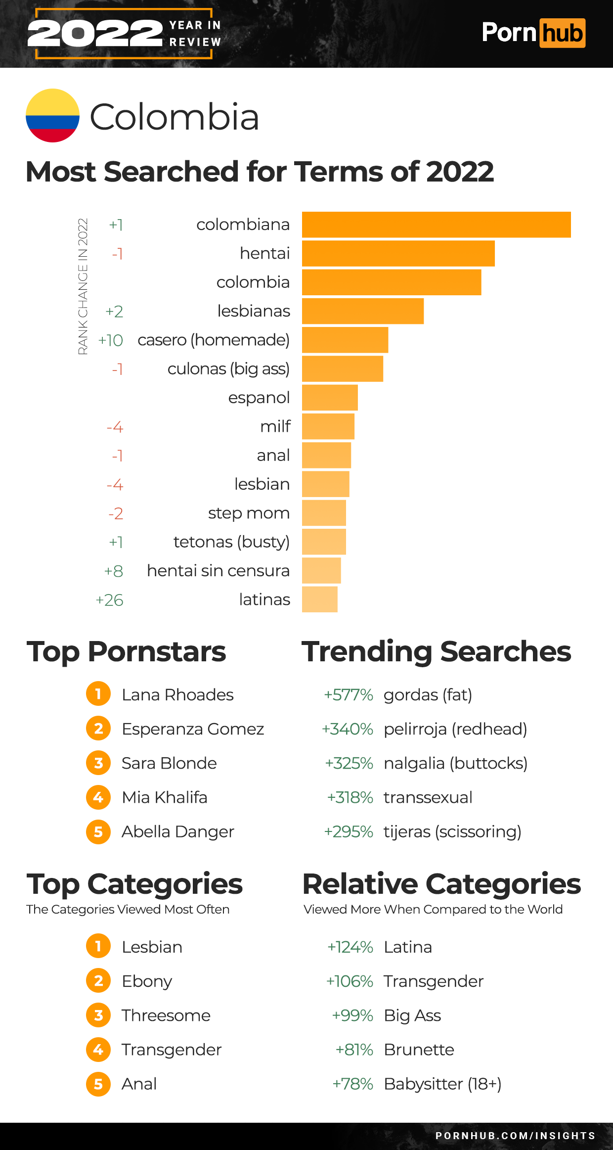 Mexico’s Top 5 searches remained the same for 2022. Leading the list was “hentai” followed by “lesbianas” and “milf”. Searches for “Espanol” grew +2 in rank, and “Colombiana” by +16. Threesome became the 2nd most popular category of video in Mexico, and Transgender the 3rd. Trending searches for 2022 included a +409% increase for “transexuales” and +163% for “asmr roleplay”. Mexicans are +91% more likely to watch Big Ass videos, and +81% more into Brunette when compared to the rest of the world.