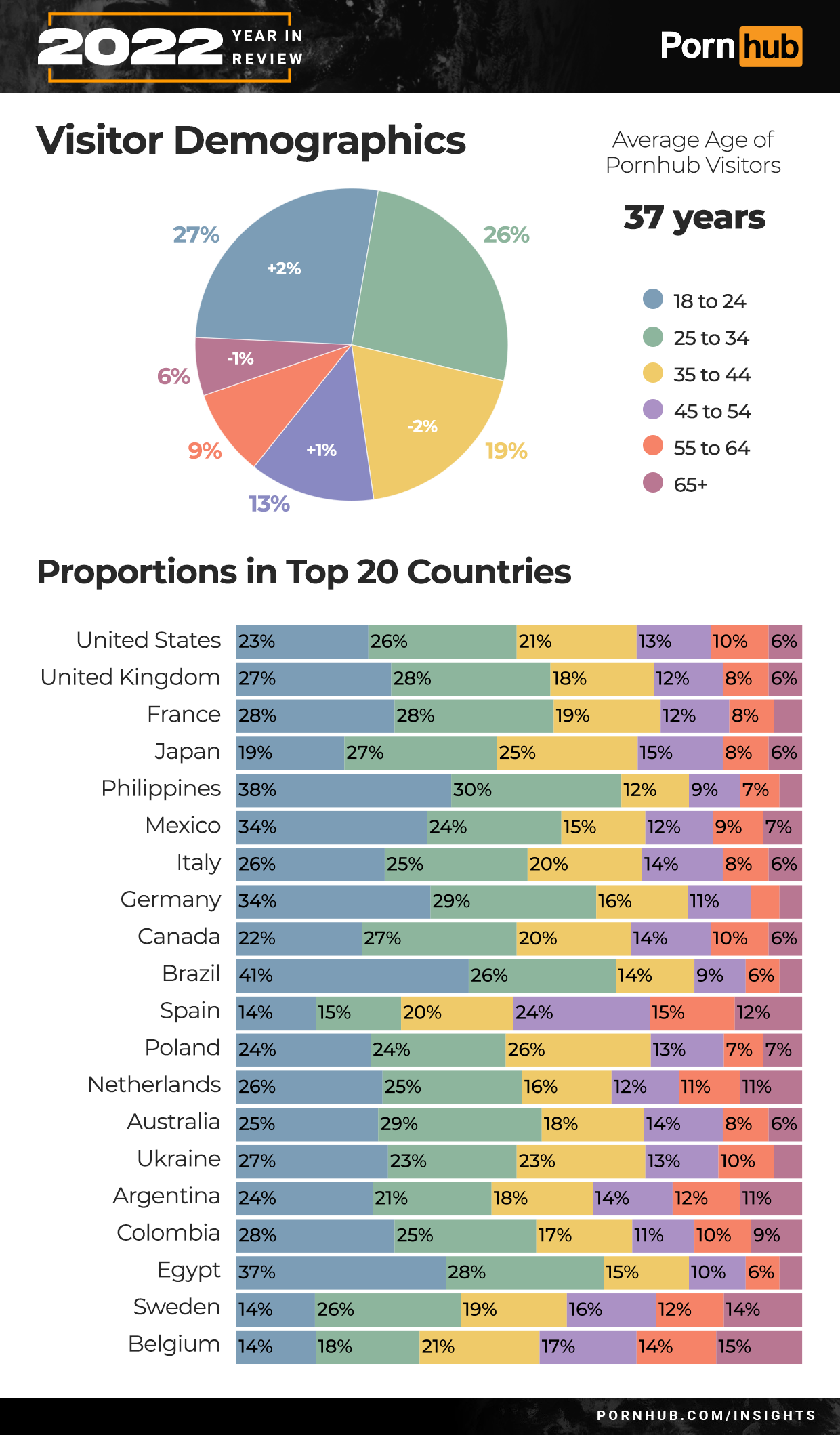 Pornhub’s average visitor age remained 37 for 2022, with the 18 to 24 group growing by +2 percentage points, and the 35 to 44 age group dropping by –2% percentage points.