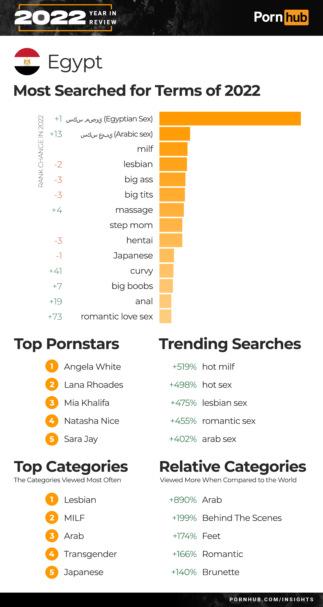 Egypt joined our Top 20 countries for the first time in 2022 as searches for “Egyptian sex” and “Arabic sex” both grew in popularity to become the country’s top two searches. “Massage” searches grew +4 in rank as did “curvy” by +41 and “anal” by +19. Trending searches for the year included a 498% increase for “hot sex”, and a 455% increase in “romantic sex” searches. Visitors from Egypt are 890% more likely to view Arab videos, 174% more into Feet and 166% more into Romantic videos when compared to the rest of the world.