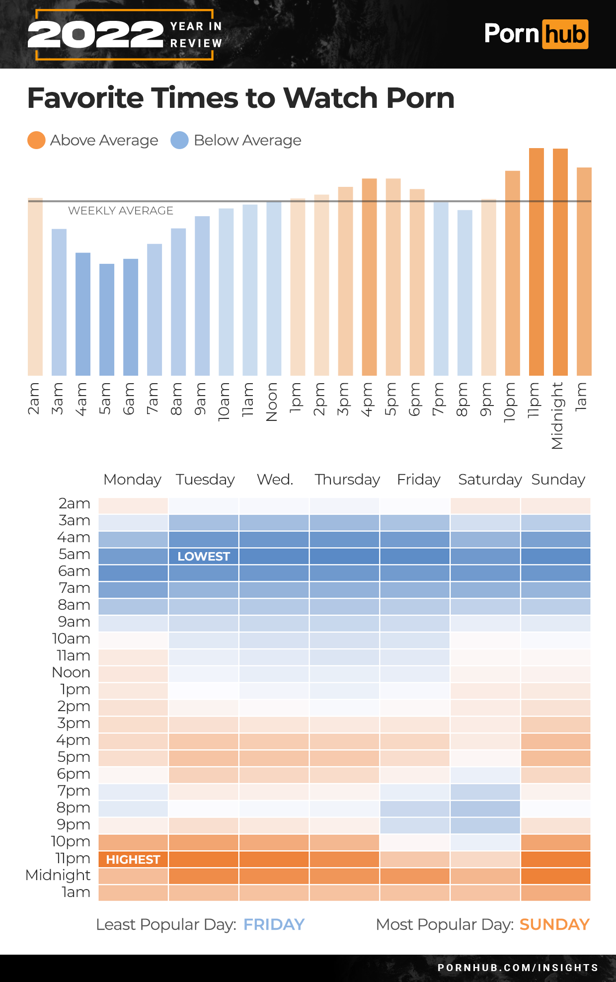 Worldwide, and indeed in most countries we have studied, Sunday is the most popular day to visit Pornhub, while Friday tends to have the lowest traffic. A lot of that has to do with the hours people prefer to watch porn. Peak viewing times are typically from 10pm to 1am, but on weekends (as people tend to stay up later and sleep in longer), the view time shifts into the morning hours.