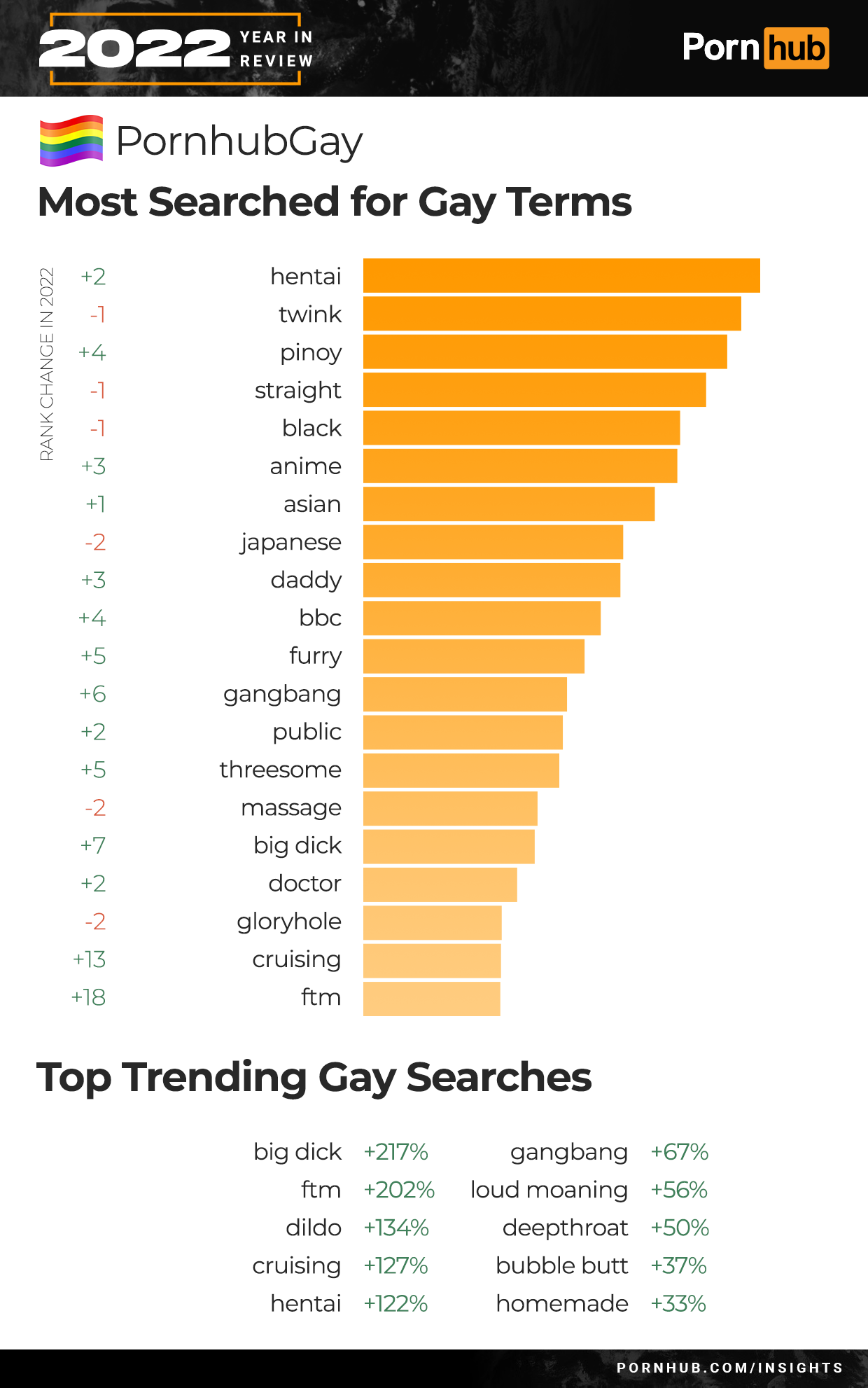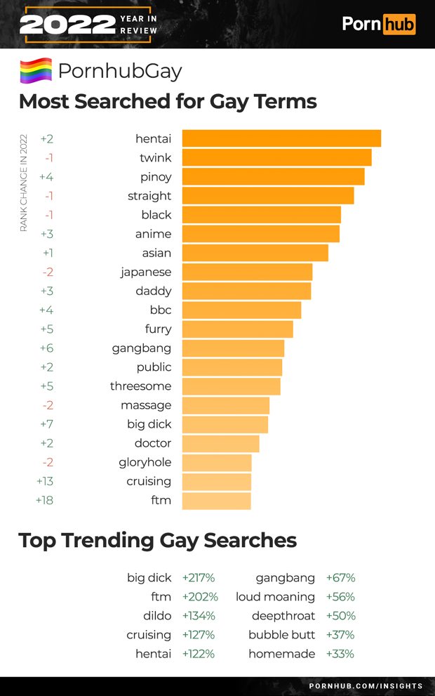 For many of the Searches that Defined 2022, our statisticians found the same trends happening on PornhubGay. “Threesome” increased +5 in rank, and “gangbang” searches increased by +67%. Trans searches for “FTM” (female to male) grew by +202% and joined the Top 20 gay searches. Searches for “homemade” porn grew by +33% and “cruising” by +127%.