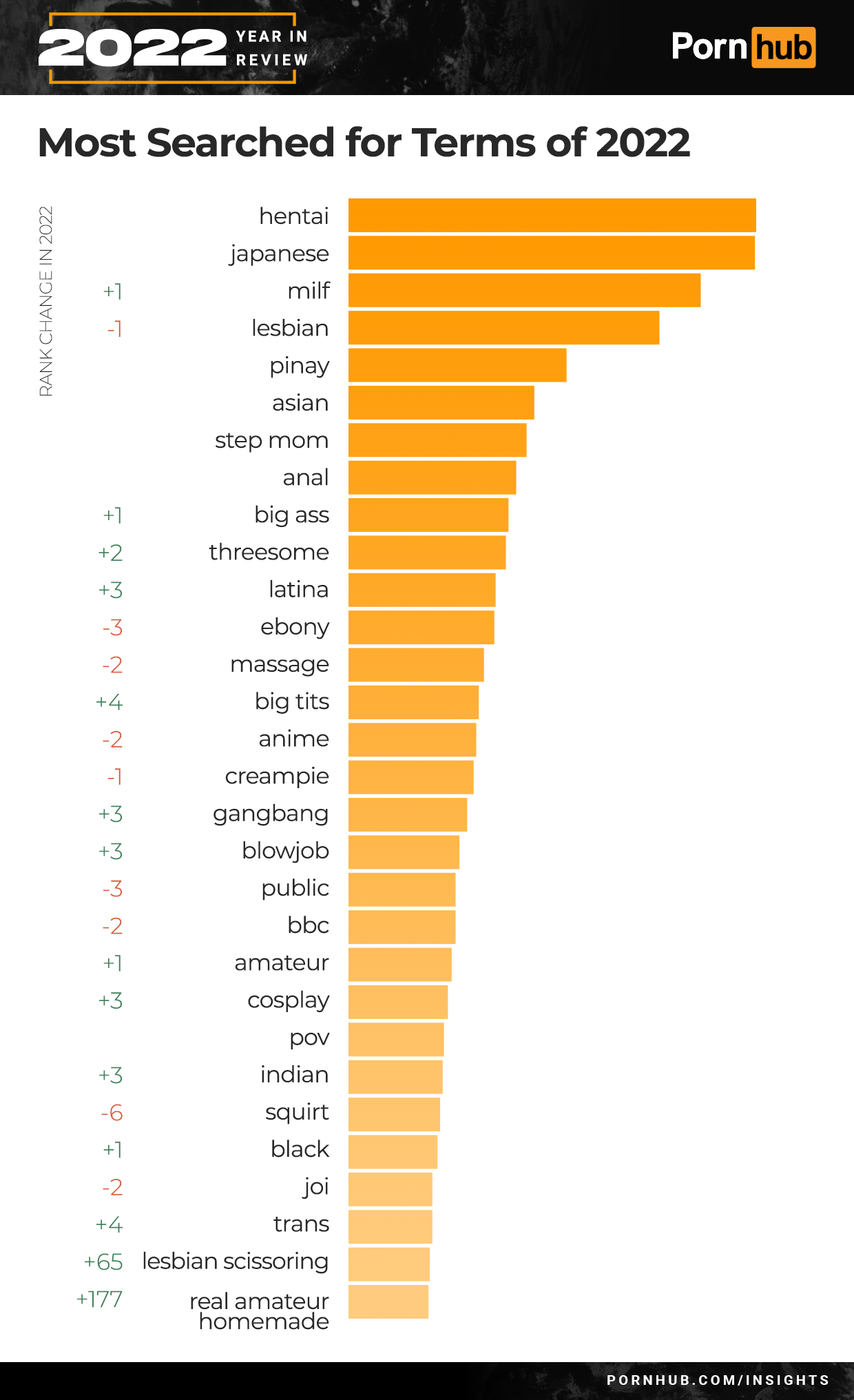 2022 saw “lesbian” become the favorite search in the United States, replacing last year’s favorite “hentai”. In 2019 and 2017 the top US term was “lesbian”, as was “milf” in 2018.