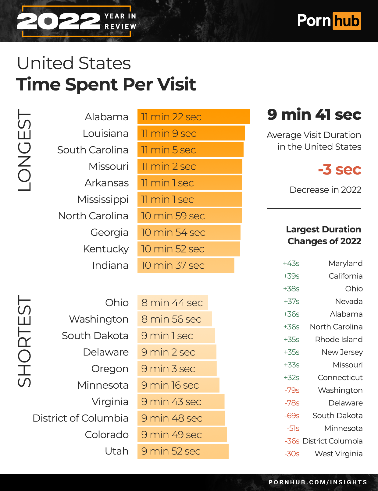 2022 saw Pornhub’s average visit duration decrease by -1 second to 9 minutes and 54 seconds. Most of the Top 20 countries however saw an increase in duration, including a nearly half a minute longer in Japan, Germany and Sweden. Canadians came and went -20 seconds faster, as did Filipinos by -32 seconds compared to their 2021 average.