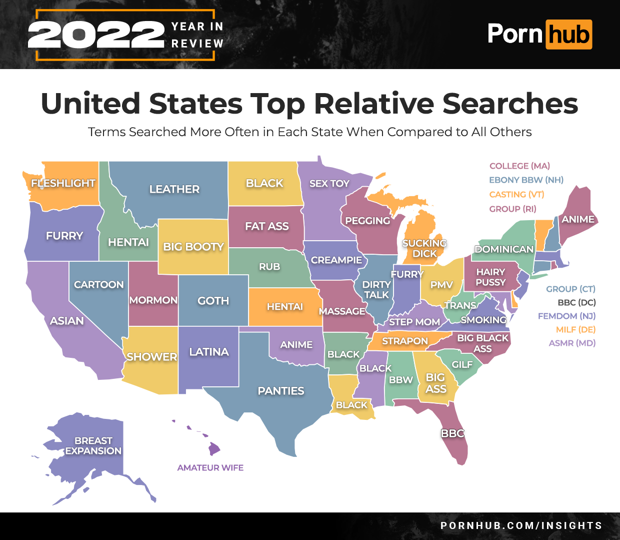 Folks from Alaska are more into “breast expansion” than other Americans, South Carolina likes “GILF” (granny I’d like to fuck) porn, Arizona needs to “shower” more and Illinois just likes some “dirty talk”. Oregon and Indiana are both more likely to search “furry”, but Pennsylvania will look for some “hairy pussy” instead. It seems fitting that America’s wang (aka Florida) was looking more often at “bbc” (big black cock).