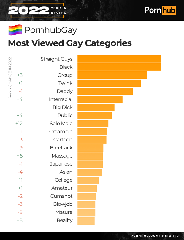 The two most viewed categories of gay porn continued to be Straight Guys and Black, but Group videos gained +3 to become the 3rd most popular category, ahead of Twink and Daddy. Solo Male videos shot up +12, while Bareback was down by –9 in popularity. As with our year’s defining trends, views of Reality videos increased +8 positions to join the Top 20 on PornhubGay.