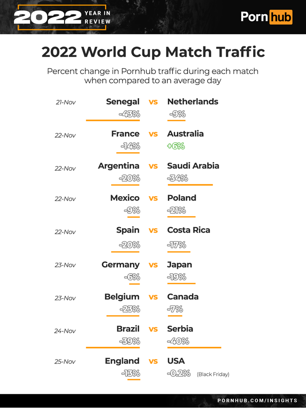 In the match between Belgium and Canada, nearly a quarter of Belgium’s gave up porn during the match, while Canada had only a -7% drop in Canada. Brazil and Serbia were the most evenly matched, at least when it came to the proportion of sports fans vs Pornhub fans. Both countries had a –40% drop in traffic while their teams played on November 23rd.