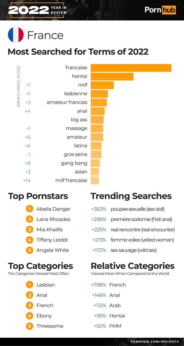 The top two searches in France remained “francaise” and “hentai”, while “milf”, “lesbienne”, “amateur francais” and “anal” all moved up into the Top 5. “poupee sexuelle” (sex doll) searches grew +363% and “real rencountre” (real encounter) by +225%. While Lesbian is the most viewed category in France, visitors are +798% more interested in French porn and +146% more into Anal than elsewhere in the world.