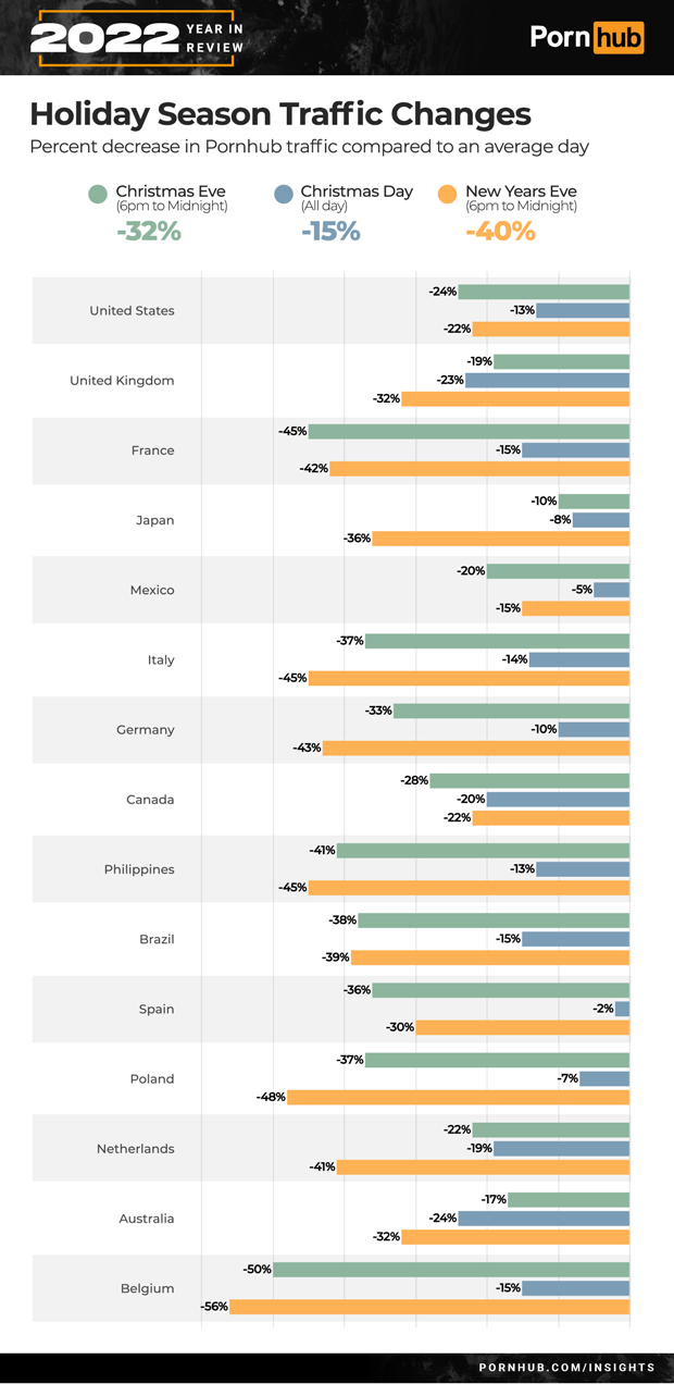 To illustrate these changes, our statisticians focused on the biggest holiday season of the year to see whether it was Christmas Eve, Christmas Day or New Year’s Eve that caused the biggest drop in Pornhub traffic.