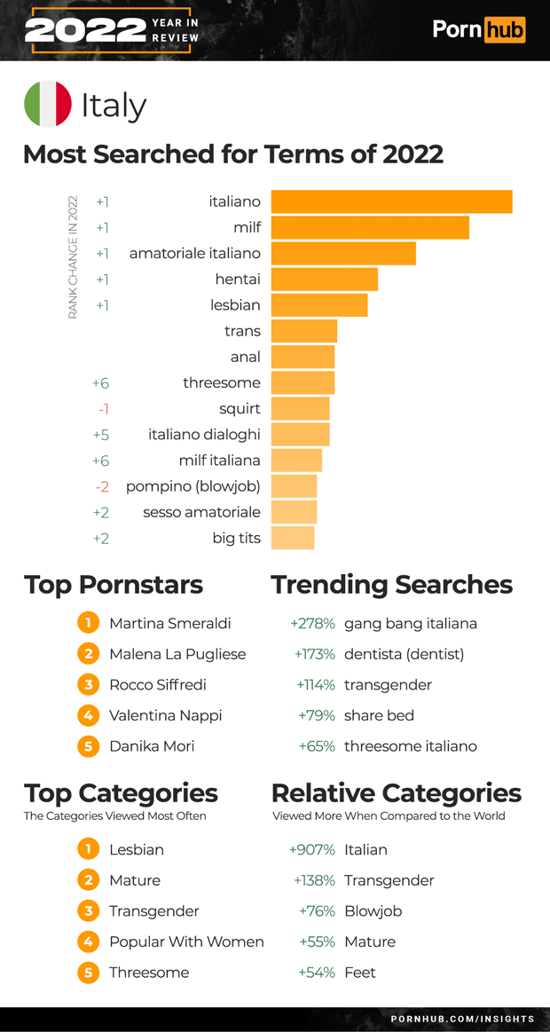 Italy’s Top 5 searches all moved up +1 spot in 2022, with “italiano” leading the list, followed by ”milf” and “amatoriale italiano”. Trending searches included a +278% increase for “gang bang italiana” and +114% growth in “transgender” searches. Transgender also became the 3rd most popular category in Italy, just after Mature and Lesbian. Italian visitors are +907% more likely to view the Italian category, +138% more into Transgender porn and +76% more interested in Blowjobs compared to the rest of the world.
