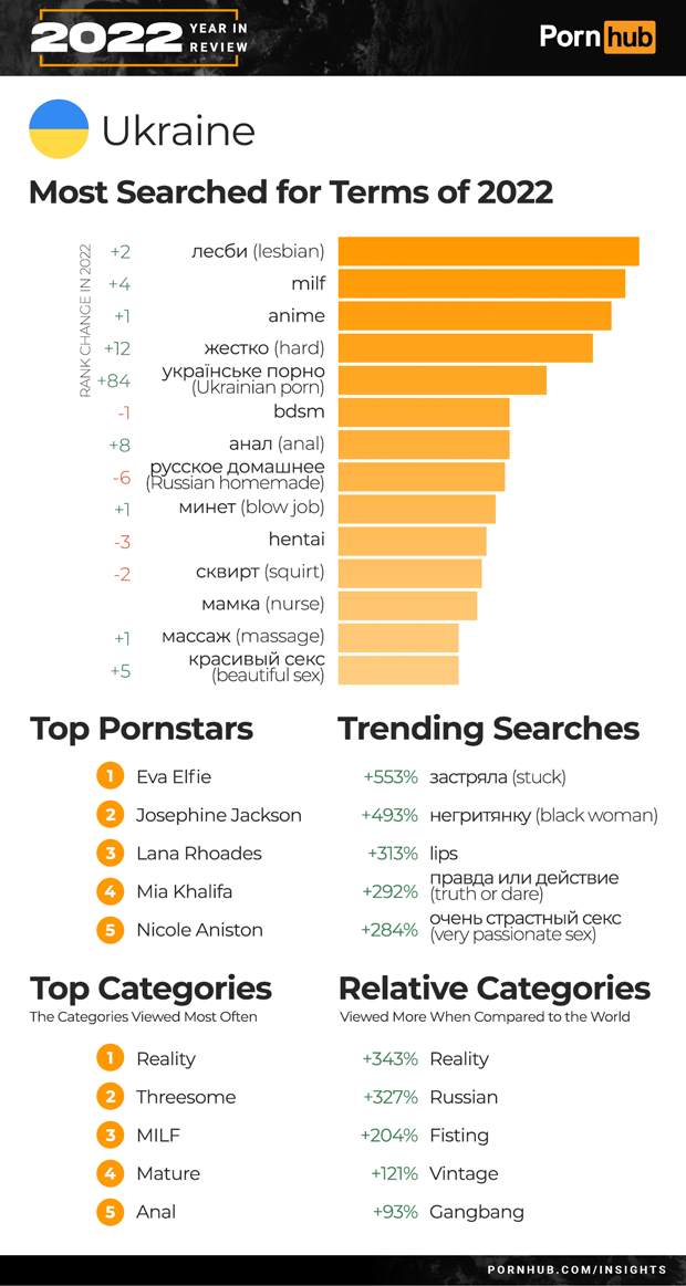 In the Ukraine, searches for “lesbian”, “MILF”, “anime and “hard” all grew in rank to join the Top 5 most popular searches. In 2021 the most popular search in Ukraine was for “Russian homemade”, however the popularity of the term decreased -6 while searches for “Ukrainian porn” grew +84 positions to join the country’s Top 5 searches. Trending terms for the year included a 553% increase for “stuck”, a 493% increase for “black woman” and a 292% increase for “truth or dare”. Ukraine was the only Top 20 country to have Reality as its most viewed category, followed by Threesome and MILF. Ukrainians are also 343% more likely to view Reality videos and they are still 327% more likely to view videos in the Russian category.