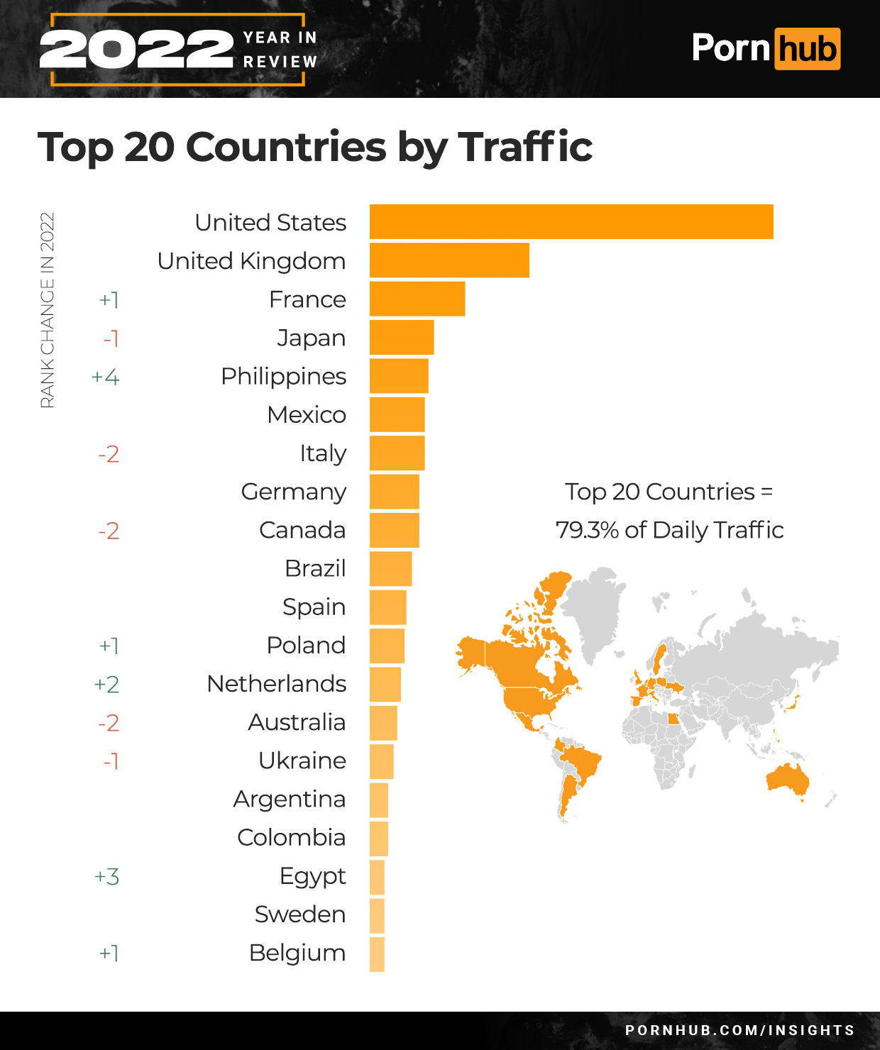 Once again, the United States continues to be the country with the highest daily traffic to Pornhub, followed by the United Kingdom. In 2022, France moved +1 ahead of Japan, Italy fell -2 behind Mexico, and Canada dropped -1 behind Germany. Egypt’s rank increased by +3 to join our Top 20 for the first time, and Belgium is back! It last made our Top 20 in 2017.