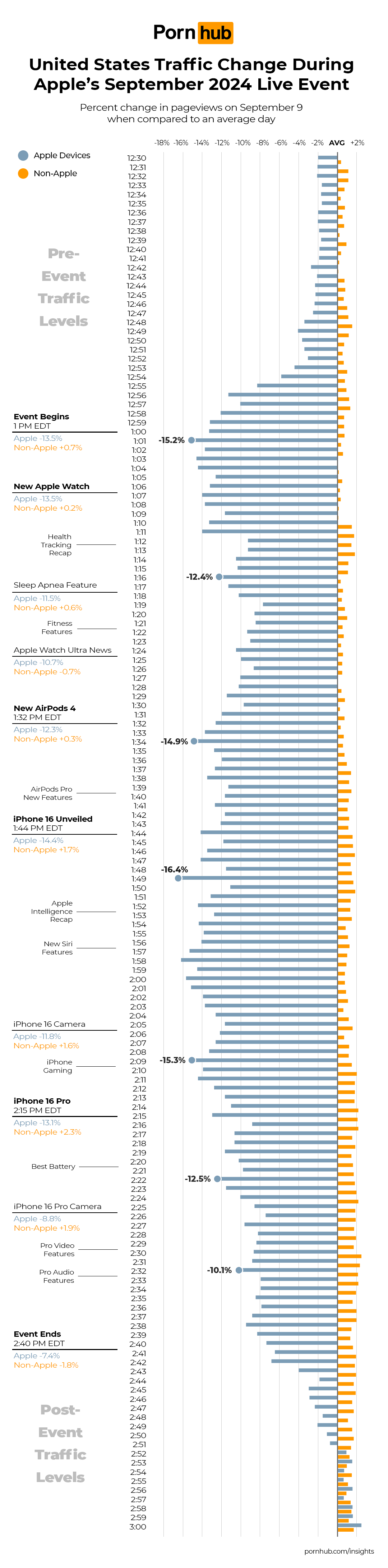 Every year millions of people around the world tune into the big Apple event streamed online. All the innovative products of the year are presented to consumers, from iPhones to Apple Watches to other gadgets the company is set to release later in the year. So, when our friends at Mashable asked our statisticians to pull the data and see how it affected the activity on Pornhub, they were happy to oblige!