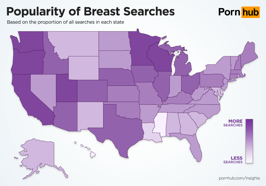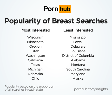Now let’s take a look at how breasts stack up across the United States of America. Proportionately, the states most interested in search for breasts are Wisconsin, Minnesota, Oregon, Utah and Washington. Visitors from Mississippi, Hawaii, Delaware, Louisiana and the District of Colombia have the lowest proportion of searches.