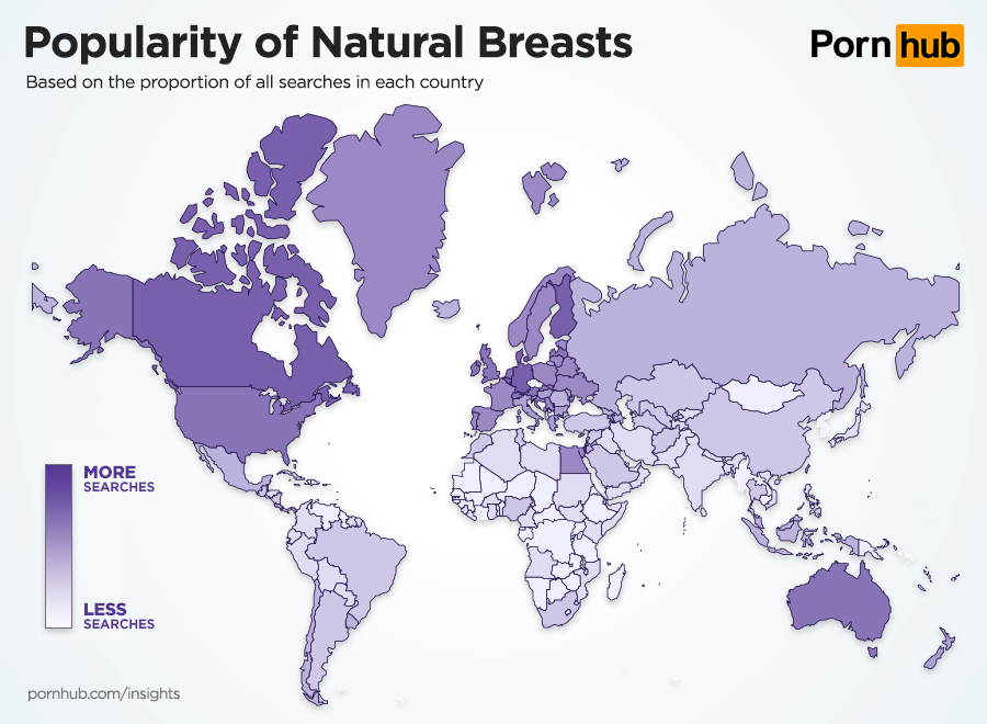 The number one breast related search on Pornhub is “big tits”, followed by “big boobs” and “huge tits”. It seems that authenticity is important to Pornhub’s visitors, as “big natural boobs” rank fourth overall — in fact any searches related to fake boobs don’t make the top 25 of breast related terms.