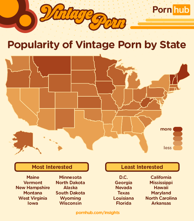 Maine, Vermont and New Hampshire are the states where vintage porn is proportionately the most popular. Vintage porn is least popular in the District of Columbia, along with Georgia, Nevada and Texas.