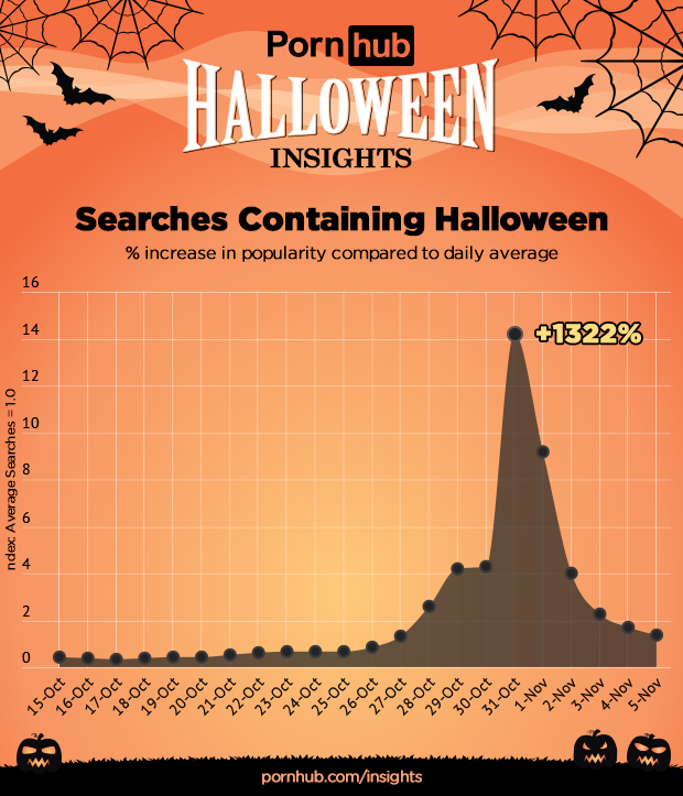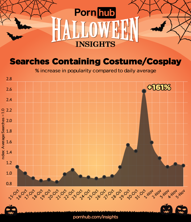 “Costume” and “Cosplay” (NSFW) are popular searches throughout the year, but even they see an increase of 161% on October 31st.