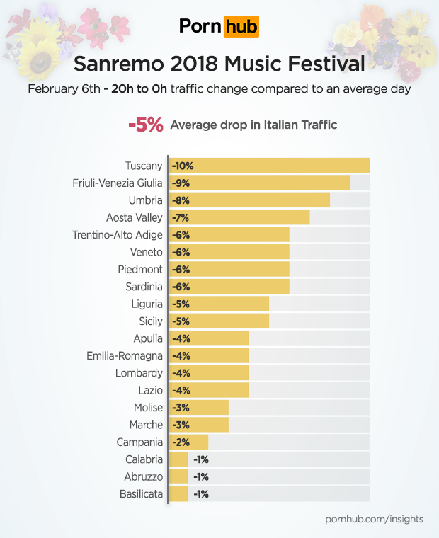 Si registra poi il maggior calo del traffico (6%) su Pornhub alle ore 22:00, momento in cui Claudio Baglioni e Fiorello hanno tenuto tutta l’Italia alla larga dal porno cantanto insieme “E tu”.