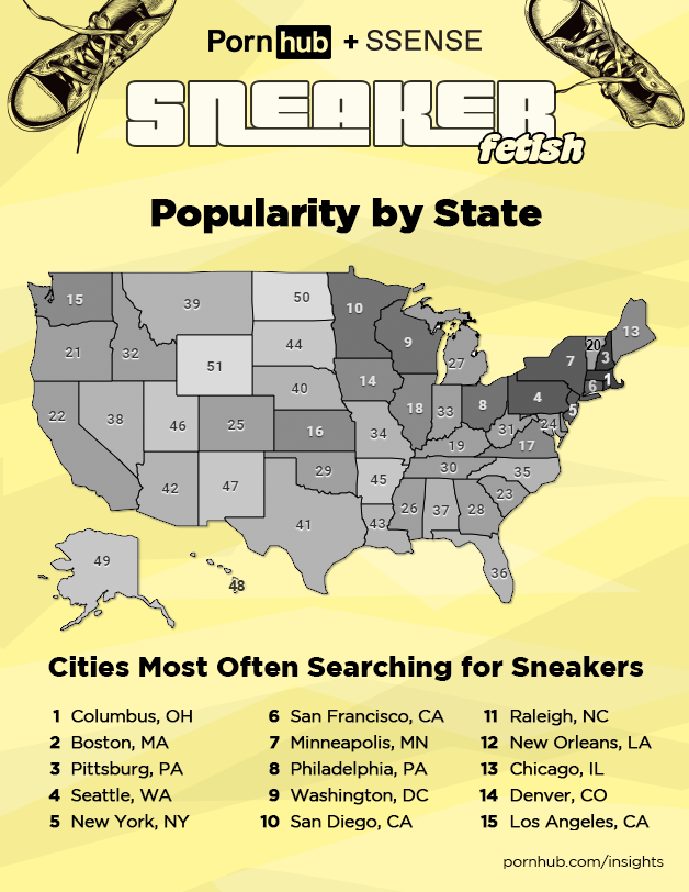 The North East appears to be the center of sneaker searches across the United States. Although Columbus, Ohio ranks highest among cities, the state of Massachusetts is proportionately the most likely to search for sneakers, followed by Rhode Island, New Hampshire and Pennsylvania. Sneaker searches are least popular in Alaska, North Dakota and Wyoming.