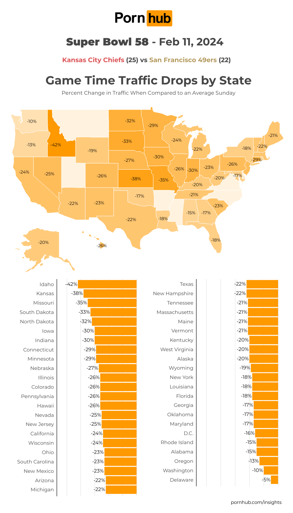 Across America, traffic was down compared to an average day. Our statisticians pulled some data to find out which states were most interested, and which states didn’t seem too phased. Overall, traffic was down –21% during the game.