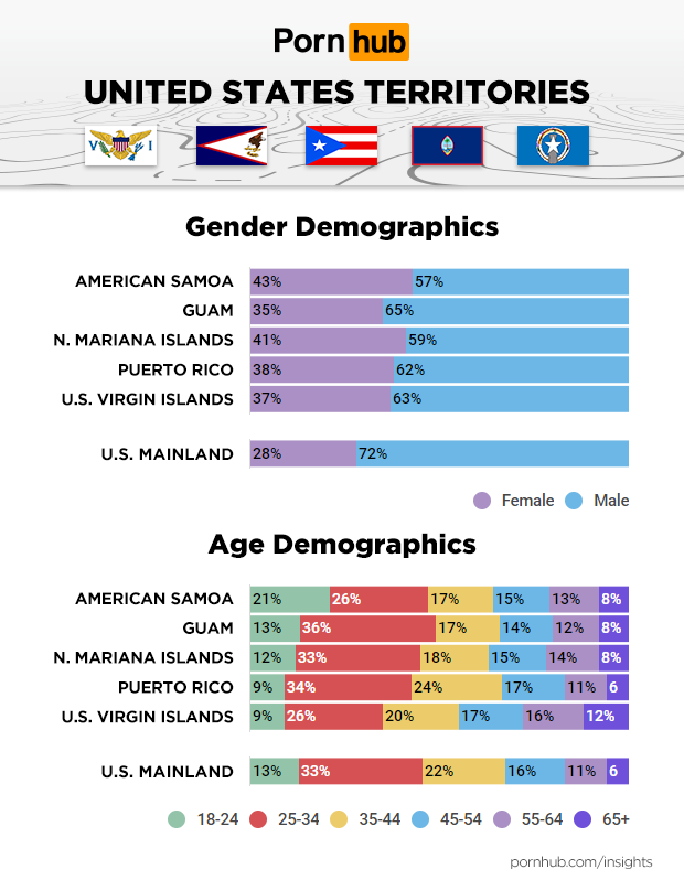 Over the last several years the Pornhub Insights team has provided a myriad of data on the United States and its 50 states but we’ve never taken a close look at the U.S. territories. Well that day has finally arrived! Today our statisticians are serving up fresh data on the porn viewing preferences of Puerto Rico, the Northern Mariana and Virgin Islands, Guam and American Samoa.
